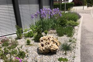„Obwohl viele Leute am Anfang skeptisch waren, als ich eigenhändig die Stauden in das Erd/Kiesgemisch gepflanzt habe, höre ich heute meist, wie schön das Beet aussieht“, erzählt Claudia Lorenzer. Zwei bis dreimal im Jahr pflegt sie die Fläche, entfernt Pflanzen, die angeflogen sind und reduziert die, die sich zu stark ausbreiten. „Jedes Jahr sieht das Beet anders aus, und da es direkt an der Hauptverkehrsstraße liegt, freuen sich viele daran, die täglich vorbeikommen“, berichtet sie.