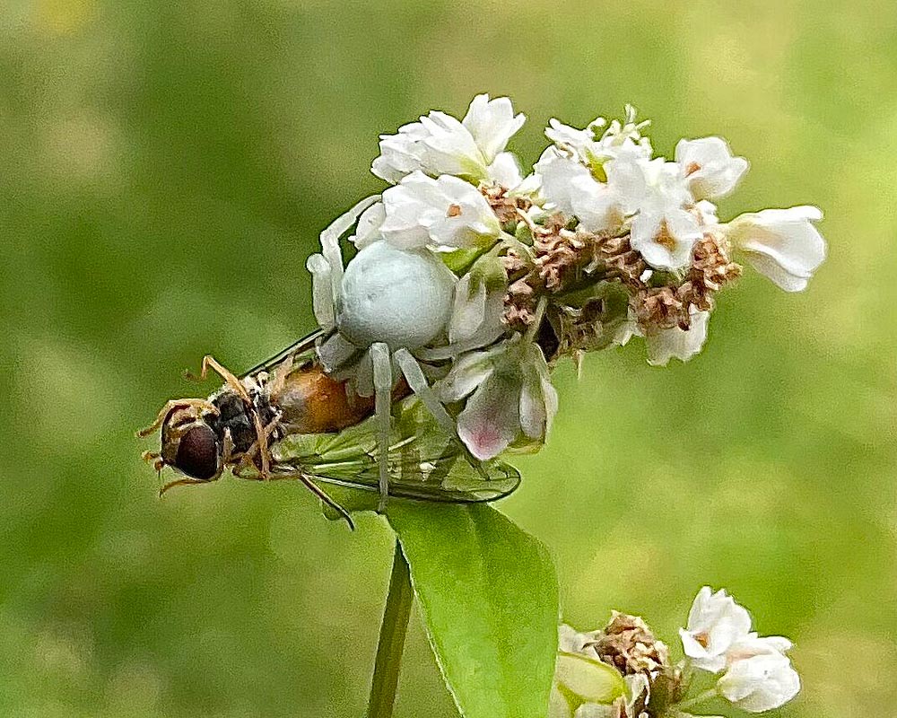 Wichtig ist auch: Dass der Garten voll ist mit Insekten. Denn Spinnen bauen ihre Netze nicht zum Wohnen, sondern zum Jagen, wie oben beschrieben. Deshalb braucht es Blüten, Blüten, nochmals Blüten und das am besten rund ums Jahr, weil Blüten Bienen und Co anlocken. Aber: auch andere Insekten sind wichtige Nahrung. Blattläuse, Mücken, Fliegen etwa. Diese lassen sich zum Beispiel »produzieren« mit verschlammten Wasserstellen, und wenn Fallobst, Hinterlassenschaften und auch ein bisschen Aas liegen bleiben darf.