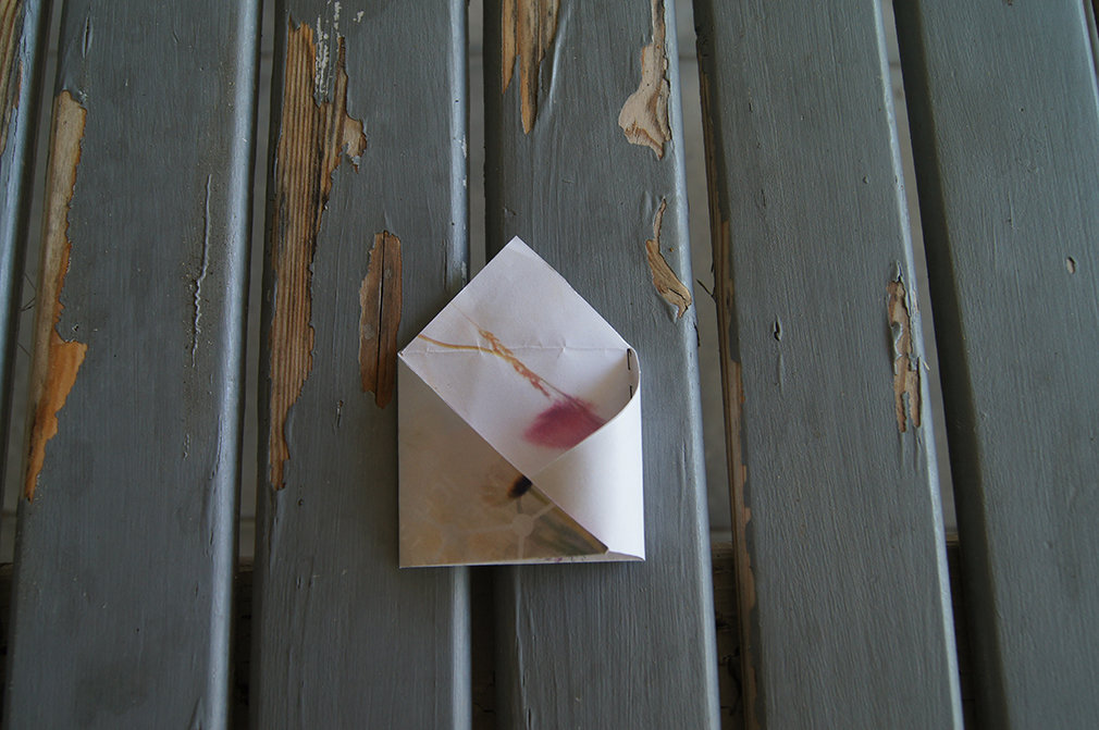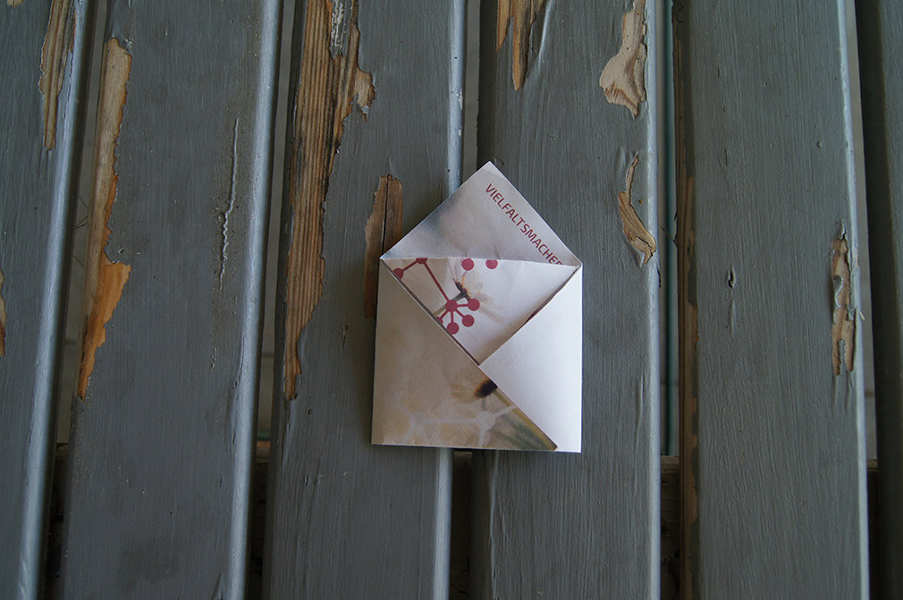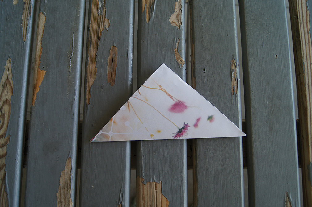 Das gegenüberliegende seitliche Drittel auch nach innen klappen und die Spitze in die entstandene Tasche stecken