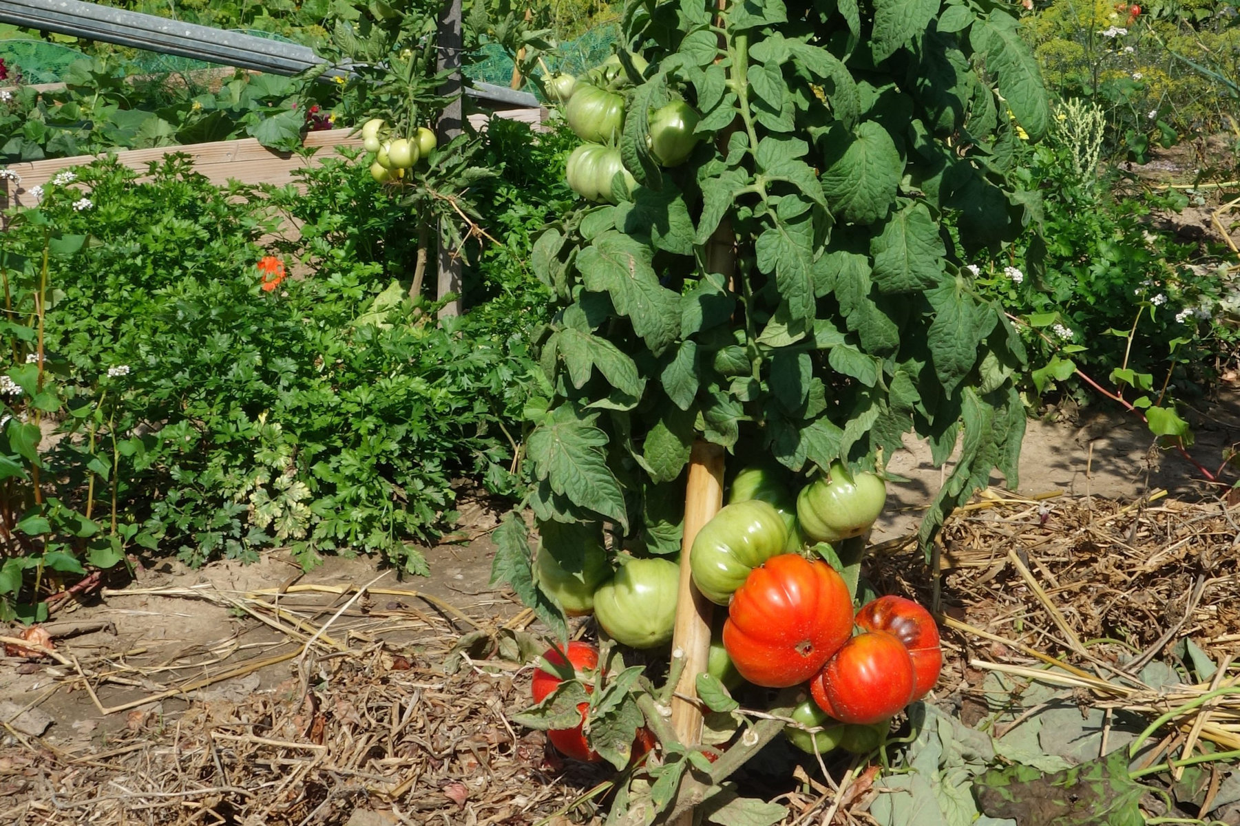 Mit größerem Abstand sind auch Kamille (Matricaria chamomilla) und Weißkraut (Brassica oleracea convar. capitata var. alba) empfehlenswerte Partner. Man kann das Beet ausschließlich mit Tomaten bepflanzen und dick mulchen, das reguliert den Feuchtigkeitshaushalt des Bodens und verlangsamt die Verdunstung.