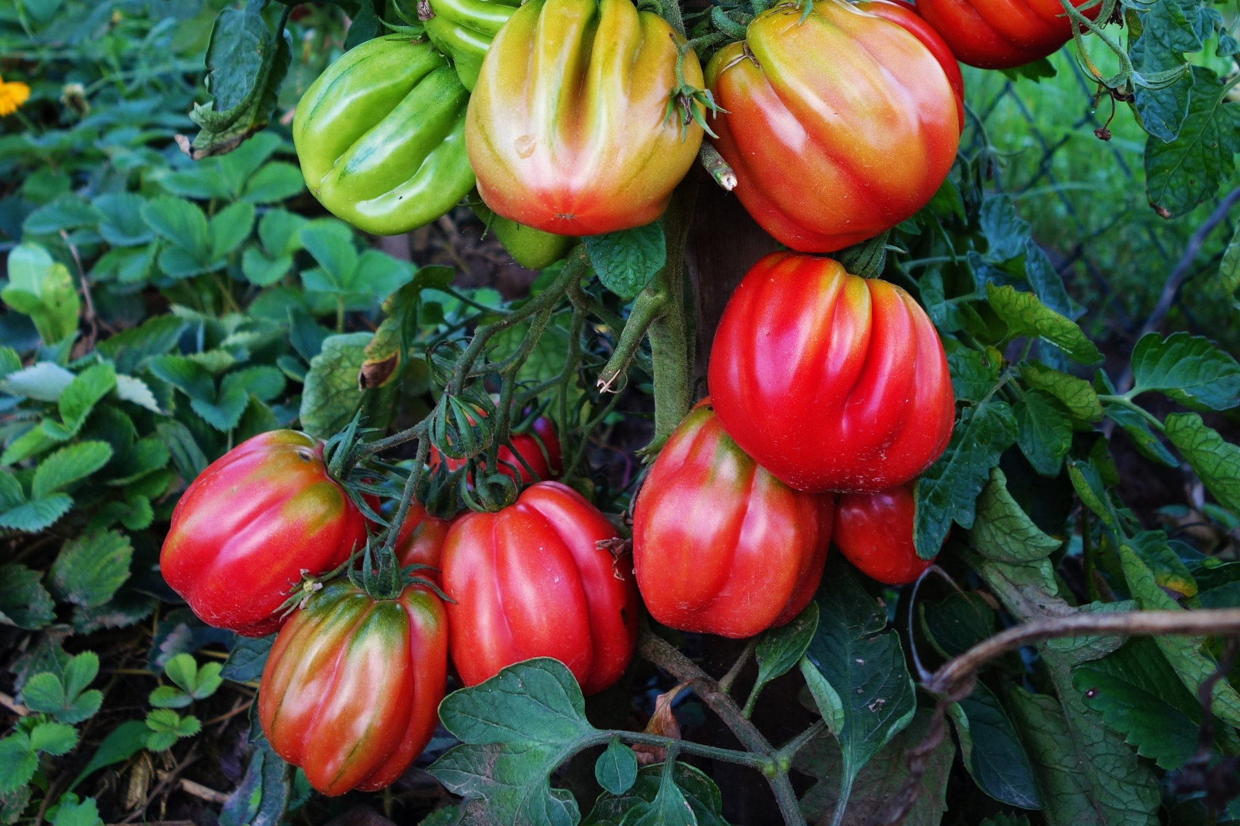Zahnradtomate: Fleischtomate mit gerippten roten Früchten, die sich gut zum Füllen eignen. Fleischtomaten sind empfindlicher und wärmebedürftiger als Sorten mit kleineren Früchten.