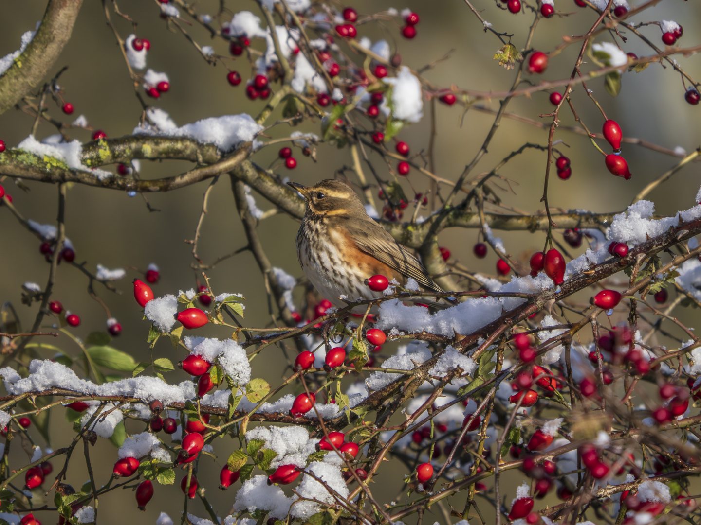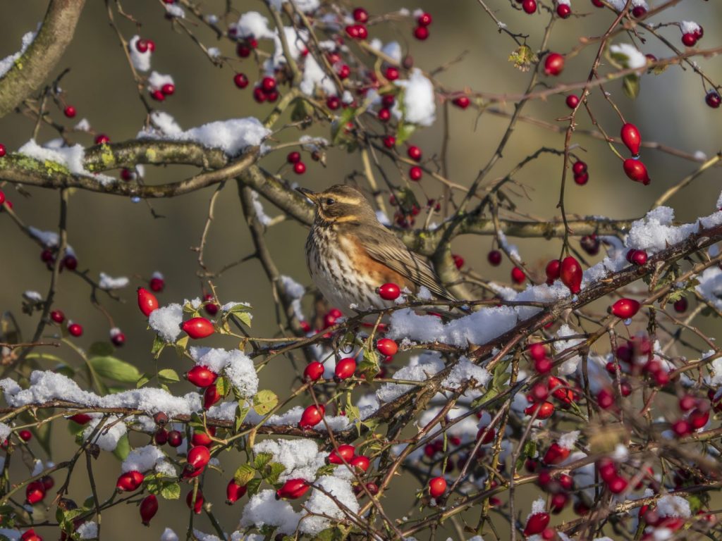 Aber nicht nur schlummernde Insekten und Staudensamen sind im Winter wichtige Nahrungsquellen für Vögel. Auch Beeren, Früchte und andere Samen liefern ihnen neben der in der kalten Jahreszeit dringend benötigten Energie auch Flüssigkeit. Wenn Fallobst liegengelassen wird und nicht alle Äpfel abgeerntet sind, freuen sich darüber im Laufe des Winters besonders Amseln, Wacholderdrosseln oder auch Rotdrosseln, die im Winter bei uns zu Gast sind und sich häufig in unseren Gärten blicken lassen. Da Vögel ein anderes Geschmacksempfinden haben als wir, geht ihr Nahrungsspektrum dabei weit über unsere menschlichen Vorlieben hinaus. So tragen Holunder, Eberesche, Efeu, Weißdorn oder Schneeball Früchte, die bei uns Menschen roh nicht essbar sind, bei Vögeln aber hoch im Kurs stehen.