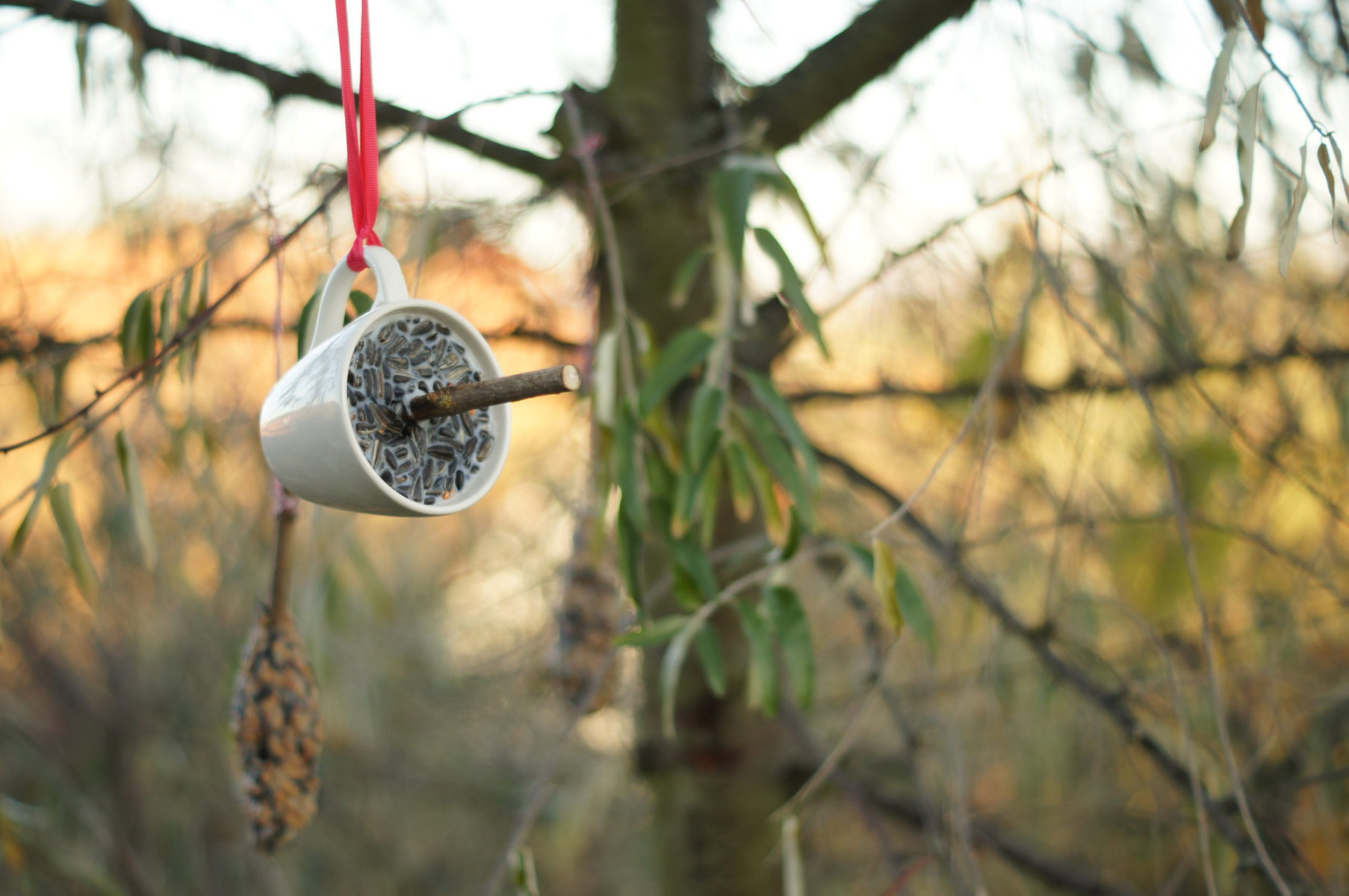 Tassen: Einen stabilen Holzstab in die Masse stecken, darauf können die Vögel dann landen. Am Tassengriff eine Schnur zum Aufhängen befestigen.